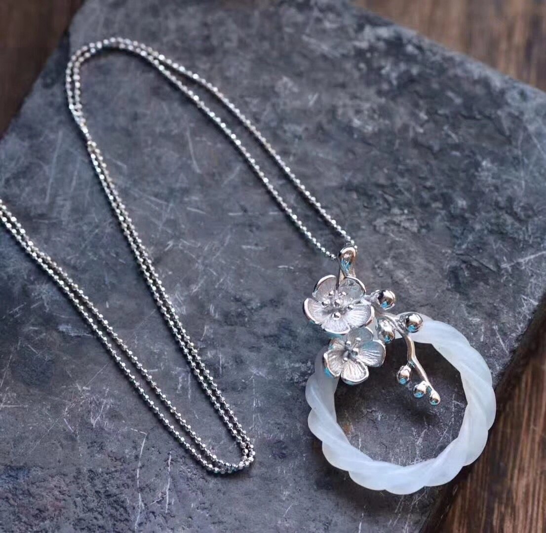 昕玉軒老翠祥梵宸銘鈺 天然和田玉和闐玉一级白玉平安扣平安福玉牌玉佩吊坠花件玉佩吊坠花件 质量好无瑕 925纯银花拖纯银链 No.1720988