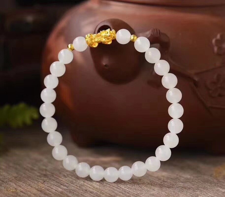 昕玉軒老翠祥梵宸銘鈺 天然和田白玉3D硬金貔貅手链手珠手环手镯 好玉配真金 和田玉是天然白皙细腻水头足高优珠 貔貅24k纯金,重量在0.27-0.3克,小隔珠18k金 主珠6mm No.1720890