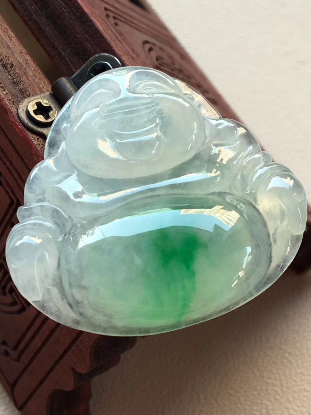 昕玉軒老翠祥梵宸銘鈺 天然翡翠精美正阳绿色冰种冰玻种干净青爽高冰种佛公彌勒佛笑佛菩薩玉佩吊坠花件 No.17209380 冰种飘绿花,色辣 尺寸27.2/29.9/6